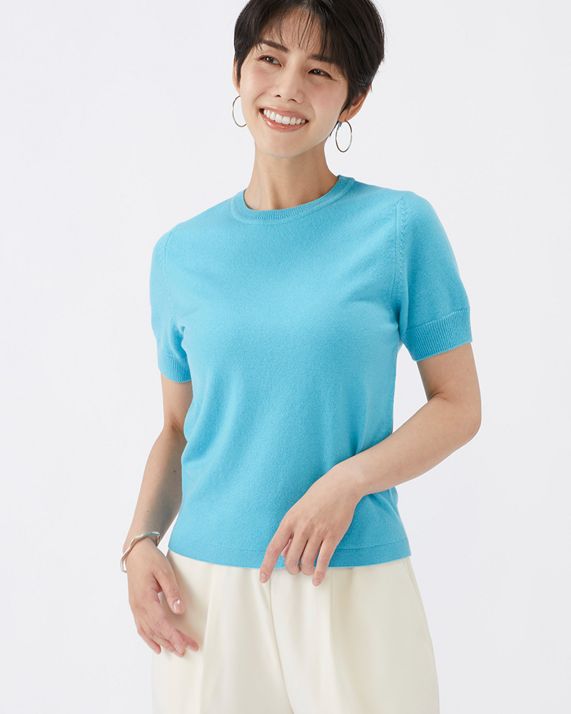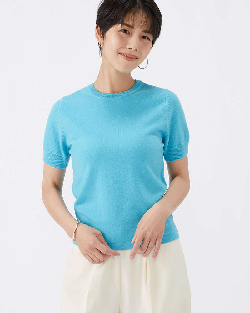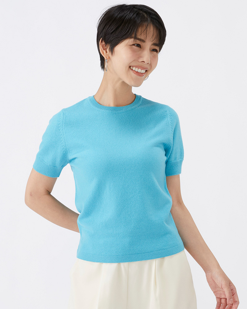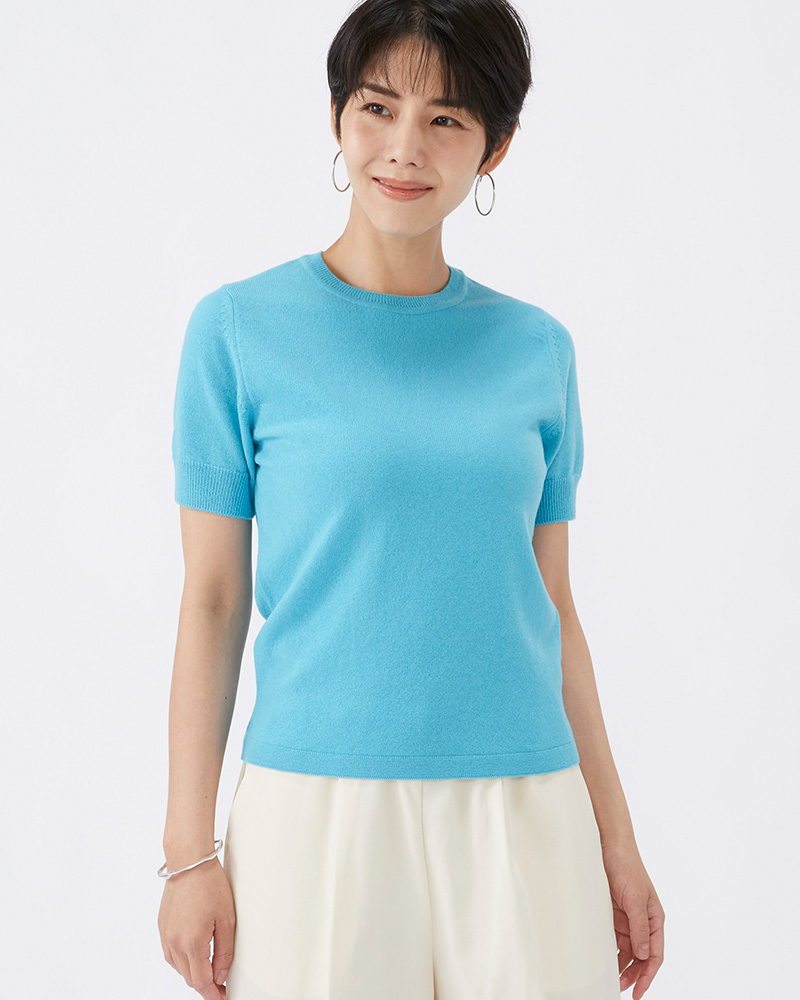 クルー半袖セーター カシミヤ【露草:Col.44】